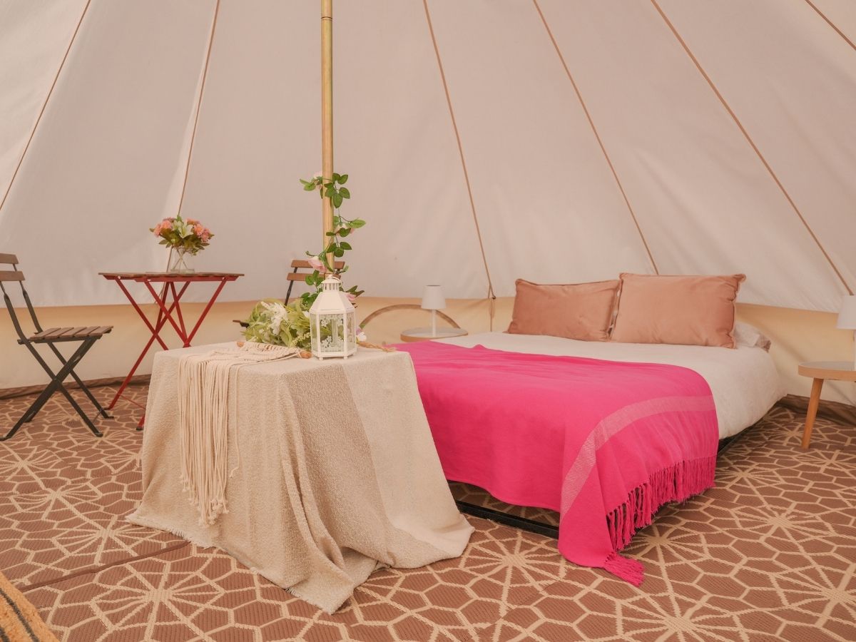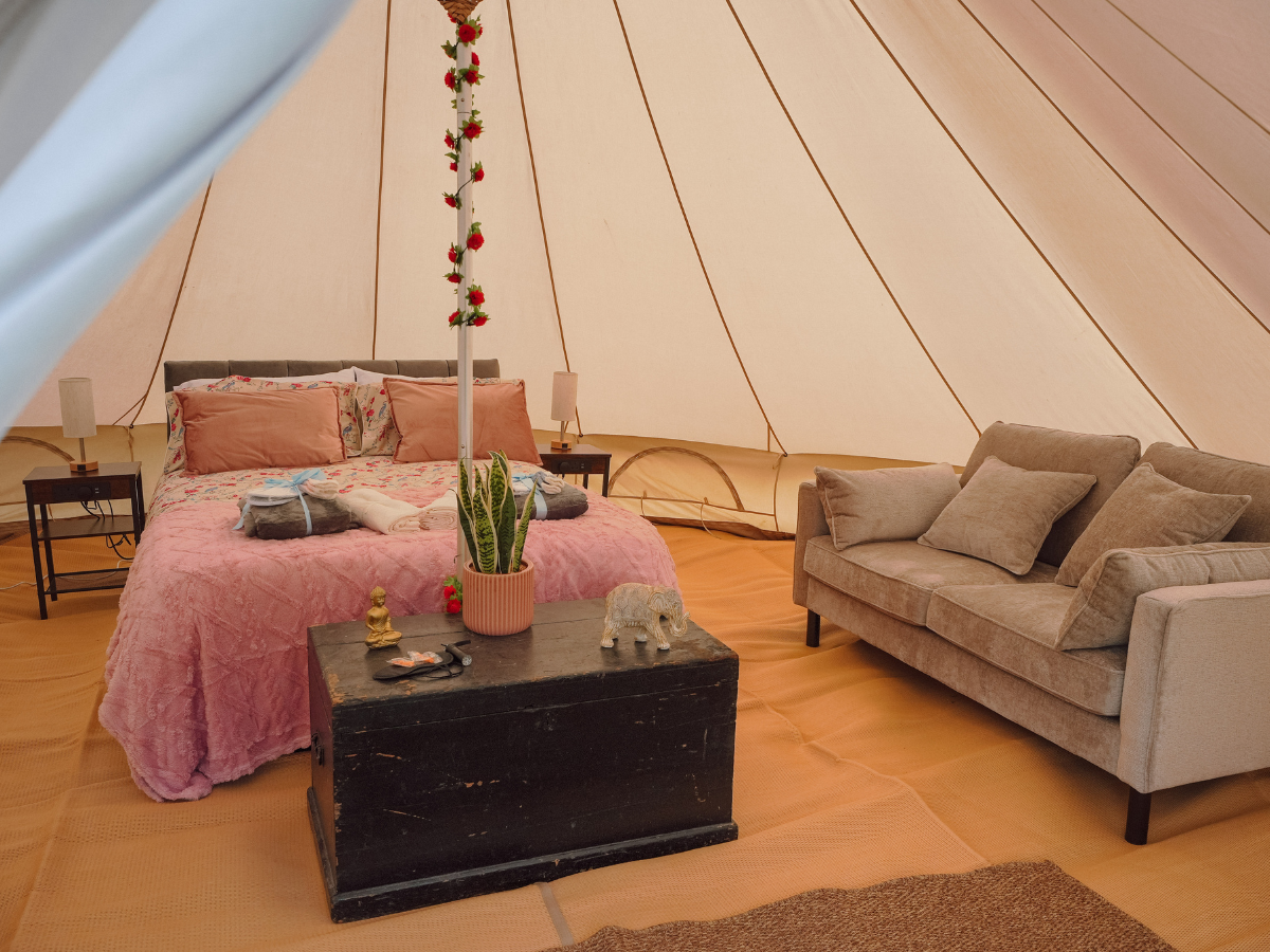 Full size double bed & mattress. Pillows, sheets, duvet, and throws, side tables with built in phone charging sockets, ambient lighting, boho decor. Your suite also includes electicity, a stocked mini fridge, sofa & breakfast table and chairs.
